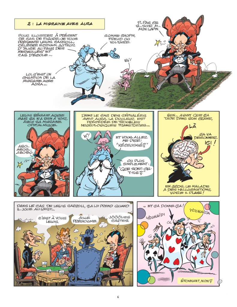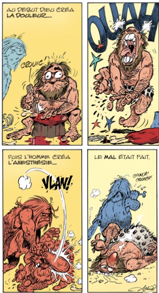 Pour parfaire nos connaissances sur la douleur, nous voyageons à travers le temps et l’espace, accompagnés par le docteur Marcel Hippocrate. Un sacré loustic ! Il faut dire qu’il débarque souvent comme un cheveu sur la soupe, apparaissant comme par magie. On le découvre arrivant d’Afghanistan sur le dos d’un bourricot, faisant de l’escalade sur Notre-Dame de Paris en plein Moyen-Âge…