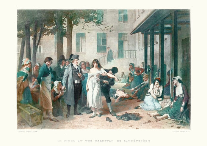 Jusqu’au XVIIIe siècle, les troubles mentaux, loin d’être associés à des pathologies, étaient plutôt perçus comme des altérations de l’âme. Les personnes atteintes étaient souvent enfermées dans des conditions inhumaines, maintenues en marge de la société aux côtés des criminels. En France, c’est avec Philippe Pinel, médecin à l’hôpital Bicêtre, que l’idée d’un traitement plus humaniste et médicalisé de ces maladies émerge. Il révolutionne la prise en charge, notamment en supprimant les chaînes des « aliénés », les considérant comme des malades pouvant être soignés plutôt que comme des individus dangereux et incurables.