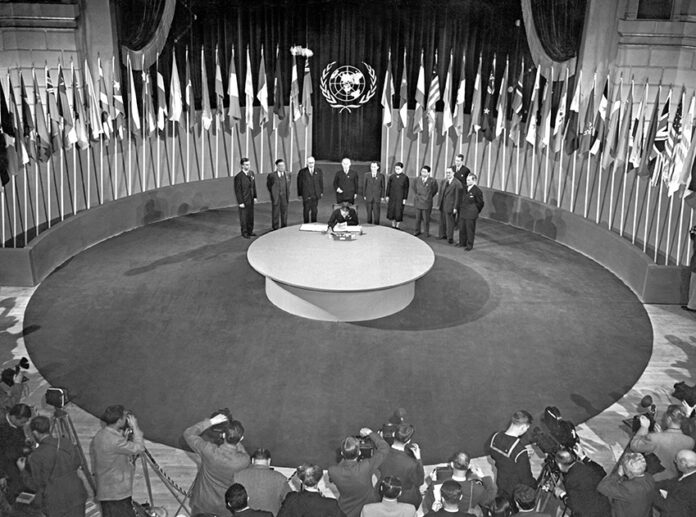 Une ovation retentit lorsque la Charte est adoptée à l’unanimité. Deux mois de discussions intenses et près de 400 réunions auront été nécessaires pour aboutir à ce texte commun. Malgré les divergences, l’ambition de la paix a été la plus forte. « Nous, peuples des Nations unies, résolus à préserver les générations futures du fléau de la guerre (…), à proclamer notre foi dans les droits fondamentaux de l’homme, dans l’égalité des droits des hommes et des femmes, ainsi que des nations, grandes et petites (…), à créer les conditions du respect du droit international », détaille le préambule du texte fondateur, ratifié lors de cette conférence de San Francisco.