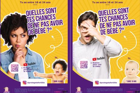 « Protège ta fertilité », est une campagne proposée par le collectif Bamp!, qui rassemble des professionnels de santé et de patients, et destinée aux jeunes de 18 à 24 ans. L’objectif ? Ouvrir la discussion autour des facteurs de risque de l’infertilité le plus tôt possible. Le moyen ? Les réseaux sociaux (@protegetafertilite), sur lesquels sont diffusés des messages de prévention. Mais aussi, des affiches que les médecins peuvent accrocher dans leur cabinet.