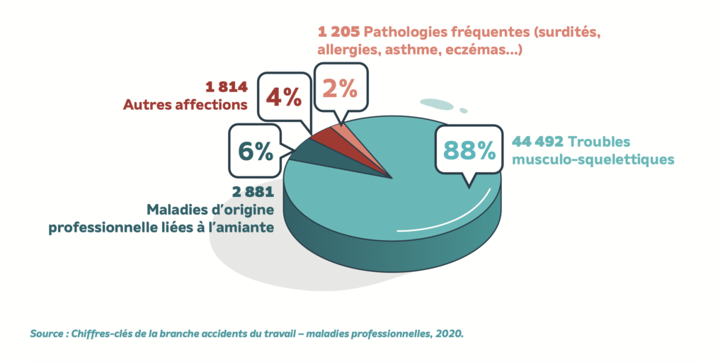 Concernant les pathologies liées au travail, les troubles musculo-squelettiques restent le plus fréquemment comptabilisés. La Mutualité Française rappelle qu’il s’agit de maladies « inflammatoires et dégénératives qui affectent les muscles, les tendons ainsi que les nerfs des membres et de la colonne vertébrale. »