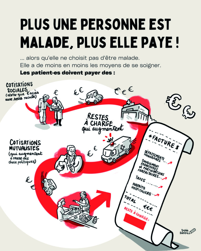 Lisa Ribeaud : Il est d’une violence sociale inédite, avec des mesures très inquiétantes. Il y a par exemple le doublement des franchises médicales et des participations forfaitaires, ces sommes qui restent à la charge des usagers, ainsi que de leurs plafonds. Concrètement, les franchises vont passer de 2 à 4 euros pour une consultation médicale, de 1 à 2 euros pour une boîte de médicaments, et de 4 à 8 euros pour le transport sanitaire. La participation forfaitaire devrait être étendue au secteur dentaire avec 4 euros pour les actes des chirurgiens-dentistes.