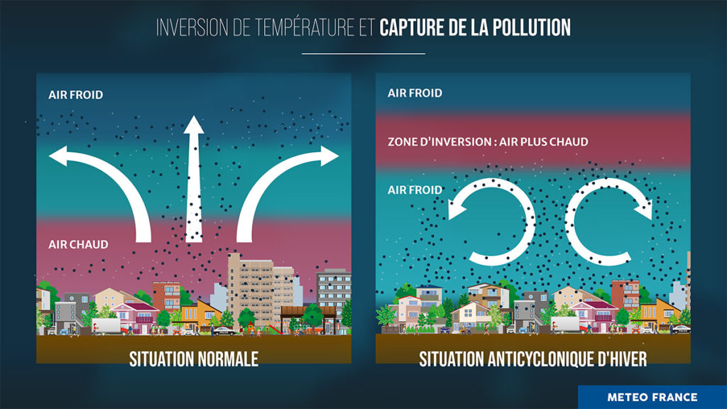 « En hiver, et plus généralement d’octobre à mars, lorsque la situation météorologique est anticyclonique, comme en ce moment, explique Météo France, en l’absence de nuage, le sol se refroidit rapidement durant la nuit. L’air près du sol est alors plus froid et donc plus lourd que l’air chaud au-dessus et reste coincé près du sol. On appelle ce phénomène “inversion de température”. Cette inversion agit comme un couvercle qui empêche la pollution de se disperser. Ce type de situation empêche aussi le brouillard ou les nuages bas (stratus) de se dissiper parfois toute la journée. »