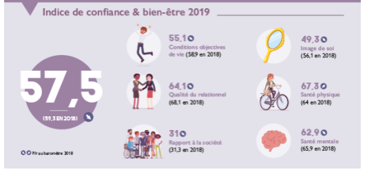 Ce n’est pas une bonne nouvelle, l’indice global de bien-être, qui s’établit sur une échelle de 0 à 100, est passé à 57,5 en 2019, soit une baisse de – 1,8 par rapport à 2018 (59,3).